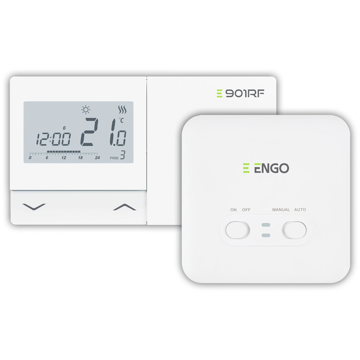 Natynkowy regulator temperatury E901RF służy do zarządzania urządzeniami oraz systemami grzewczymi i chłodzącymi. W zestawie znajduje się nadajnik, odbiornik oraz podstawka. Regulator jest zasilany dwiema bateriami AA. Jest fabrycznie sparowany z odbiornikiem, dzięki czemu od razu można korzystać z urządzenia.